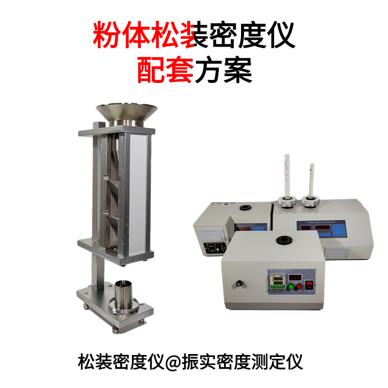 裝置 測定裝置(圖1)頂部為一個裝有1.0mm篩網(wǎng)的粉末漏斗。粉末漏斗下方依次是一個加料漏斗和一個裝有四塊玻璃擋板的擋板箱,待測粉末樣品通過加料漏斗進入擋板箱后,可沿擋板滑動和反*彈,降低下落沖力。擋板箱的底部為一個漏斗狀收集器,使粉末聚集并傾入收集器正下方具有特定容積的樣品接收杯里。樣品接收杯可為圓柱體(容積為25.00ml+0.05ml,內(nèi)徑為30.00mm±2.00mm)或正方體(容積為16.39ml±0.20ml,內(nèi)部邊長為25.400mm±0.076mm)。