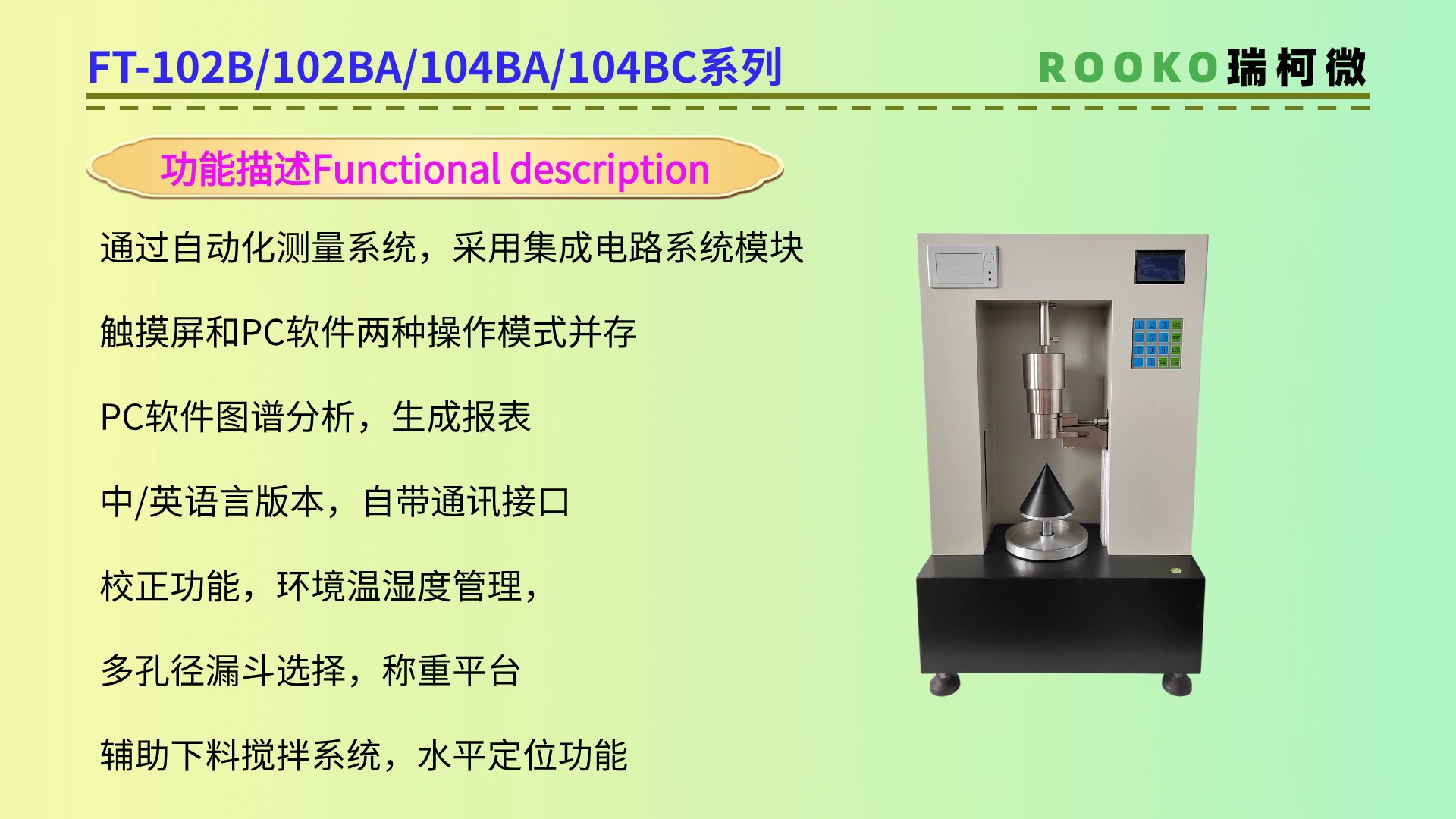 特點:休止角測定儀通常具有測量準確、操作簡便、重復性好等特點。此外,一些休止角測定儀還具有自動化測量、數據記錄和分析等功能FT-104BA。