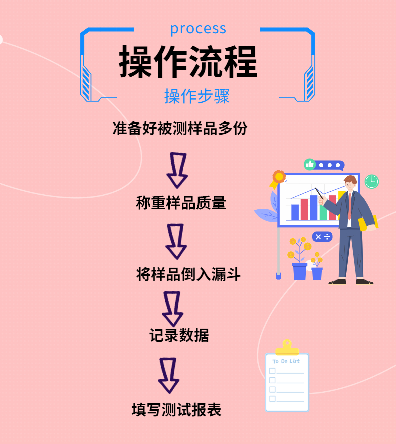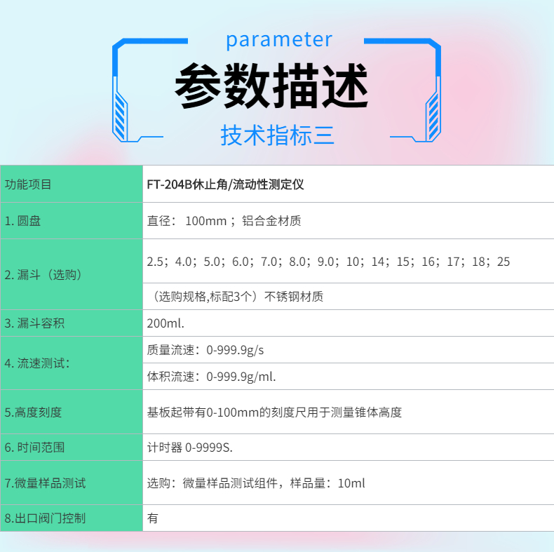 測試粉末和顆粒通過漏斗的時間和形成的角度,測試前進行預(yù)堆積,從而已知樣品量,將已知質(zhì)量粉末從漏斗流出而形成的堆積角,以及流出所需要的時間;可以獲得休止角和流速數(shù)據(jù)。