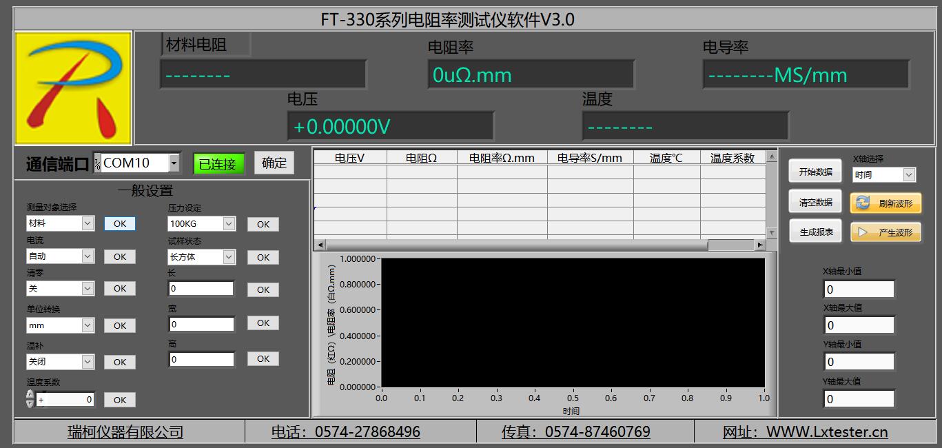 PC測試軟件USB通訊接口,軟件界面同步顯示、分析、保存和打印數據!溫度與電阻、電阻率的關系曲線;時間與電阻率、電阻的關系曲線. |